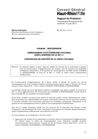 Le présent rapport a pour objet de valider les termes de la convention à passer avec la Communauté d'Agglomération de Colmar, afin de préciser les modalités techniques, financières, et de gestion de l'aménagement cyclable reliant COLMAR et WINTZENHEIM, le long de la RD 11, dans le cadre d'une superposition d'affectations.