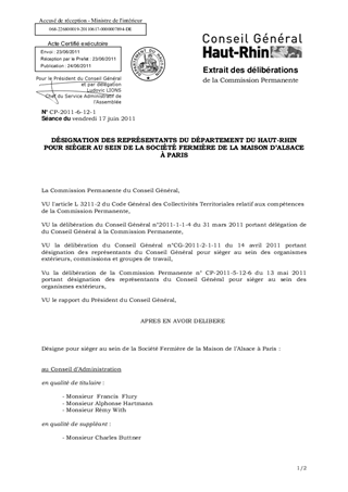 DÉSIGNATION DES REPRÉSENTANTS DU DÉPARTEMENT DU HAUT-RHIN POUR SIÉGER AU SEIN DE LA SOCIÉTÉ FERMIÈRE DE LA MAISON D’ALSACE À PARIS