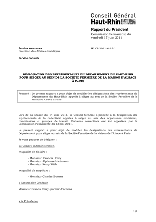 Le présent rapport a pour objet de modifier les désignations des représentants du Département du Haut-Rhin appelés à siéger au sein de la Société Fermière de la Maison d'Alsace à Paris.