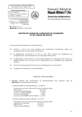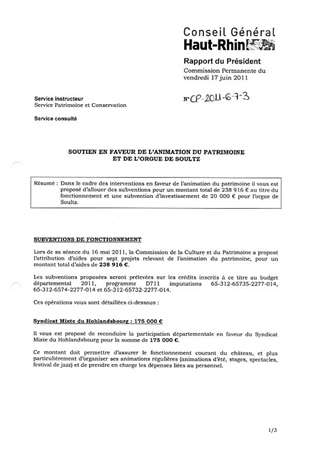Dans le cadre des interventions en faveur de l’animation du patrimoine il vous est proposé d’allouer des subventions pour un montant total de 238 916 € au titre du fonctionnement et une subvention d’investissement de 20 000 € pour l’orgue de Soultz.