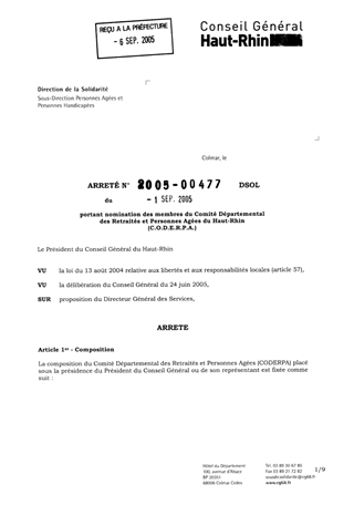 portant nomination des membres du Comité Départemental des Retraités et Personnes Agées du Haut-Rhin (C.O.D.E.R.P.A.). Resumé Pièces jointes ARRETE Assemblée : Non défini Date : 01/09/2005 Rapporteur : Non défini Collectivité : Conseil départemental du Haut-Rhin Direction : Non défini Service : Direction Adjointe Personnes Agées et Personnes Handicapées Domaine : Autres (non classés) Commission :