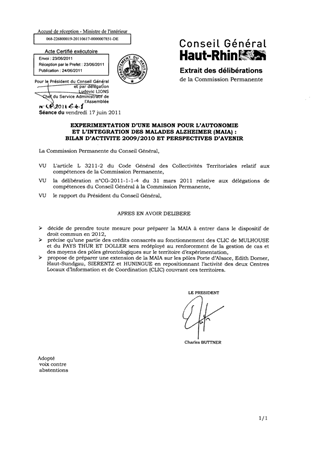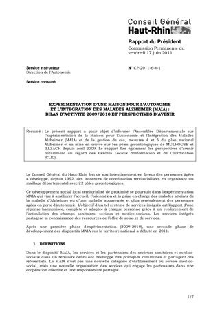 Le présent rapport a pour objet d’informer l’Assemblée Départementale sur l’expérimentation de la Maison pour l’Autonomie et l’Intégration des Malades Alzheimer (MAIA) et de la gestion de cas, mesures 4 et 5 du plan national Alzheimer et sa mise en œuvre sur les pôles gérontologiques de MULHOUSE et ILLZACH depuis avril 2009. Le rapport fixe également les perspectives d’avenir notamment au regard des Centres Locaux d’Information et de Coordination (CLIC).