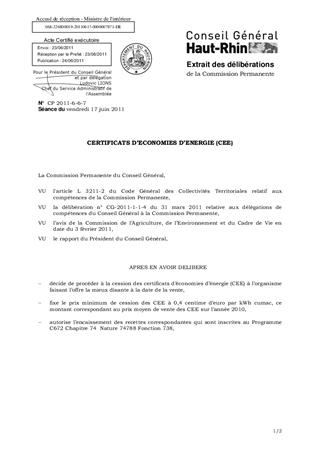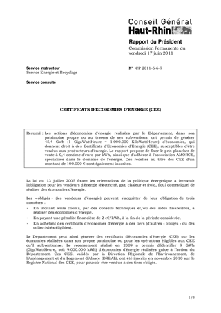 Les actions d'économies d'énergie réalisées par le Département, dans son patrimoine propre ou au travers de ses subventions, ont permis de générer 45,4 Gwh (1 GigaWattHeure = 1.000.000 KiloWattHeure) d'économies, qui donnent droit à des Certificats d'Economies d'Energie (CEE), susceptibles d'être vendus aux producteurs d'énergie. Le rapport propose de fixer le prix plancher de vente à 0,4 centime d'euro par kWh, ainsi que d'adhérer à l'association AMORCE, spécialisée dans le domaine de l'énergie. Des recettes au titre des CEE d'un montant de 100.000 € sont également inscrites.