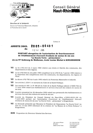 portant abrogation de l'autorisation de fonctionnement de l'établissement d'accueil d'enfants de moins de six ans "La Souris Verte - périscolaire", sis au 97 faubourg de Mulhouse, école Louise Michel à KINGERSHEIM. Resumé Pièces jointes ARRETE Assemblée : Non défini Date : 12/09/2005 Rapporteur : Non défini Collectivité : Conseil départemental du Haut-Rhin Direction : Non défini Service : Service de Protection Maternelle et Infantile Domaine : Accueil d'enfants Commission :
