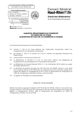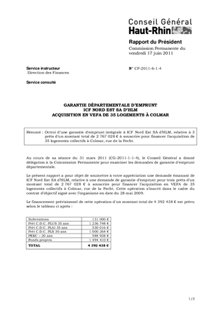 GARANTIE DÉPARTEMENTALE D’EMPRUNT ICF NORD EST SA D’HLM ACQUISITION EN VEFA DE 35 LOGEMENTS À COLMAR