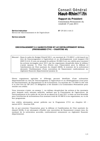 Dans le cadre du Budget Primitif 2011, un montant de 174.000 € a été inscrit au titre de l’encouragement à l’agriculture et au développement rural (rapport CG 2009 5-6-2). Il vous est proposé de prélever 49.080 € sur ces crédits pour soutenir les actions envisagées pour 2011 par les organismes récapitulés dans le tableau ci-joint (annexe 1). Pour l’un d’entre eux, l’Association pour la défense et l’amélioration de l’état sanitaire du cheptel (GDS), le montant de la subvention nécessite l’établissement d’une convention de financement conformément au règlement financier départemental (annexe 2)