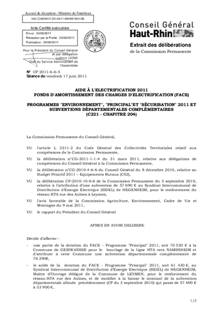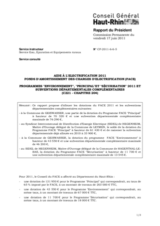 Ce rapport propose d’allouer les dotations du FACE 2011 et les subventions départementales complémentaires suivantes: - à la Commune de GEISWASSER, une partie de la dotation du Programme FACE "Principal" à hauteur de 70 520 € et une subvention départementale complémentaire maximale de 76 290 €, - au Syndicat Intercommunal de Distribution d’Energie Electrique (SIDEL) de HEGENHEIM, Maître d’Ouvrage délégué de la Commune de LEYMEN, le solde de la dotation du Programme FACE "Principal" à hauteur de 61 430 € et de ramener la subvention départementale déjà allouée en 2010 à 33 900 €, - à la Commune de GEISWASSER, la dotation du programme FACE "Environnement" à hauteur de 43 550 € et une subvention départementale complémentaire maximale de 46 200 €, - au SIDEL de HEGENHEIM, Maître d’Ouvrage délégué de la Commune de HAGENTHAL-LE-BAS, la dotation du Programme FACE "Sécurisation" à hauteur de 11 700 € et une subvention départementale complémentaire maximale de 13 545 €.