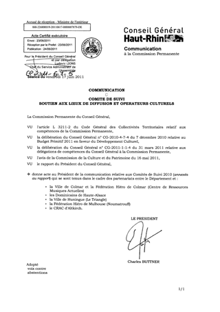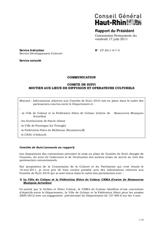 Informations relatives aux Comités de Suivi 2010 mis en place dans le cadre des partenariats conclus entre le Département et : - la Ville de Colmar et la Fédération Hiéro de Colmar (Centre de Ressources Musiques Actuelles) - les Dominicains de Haute-Alsace - la Ville de Huningue (Le Triangle) - la Fédération Hiéro de Mulhouse (Noumatrouff) - le CRAC d'Altkirch