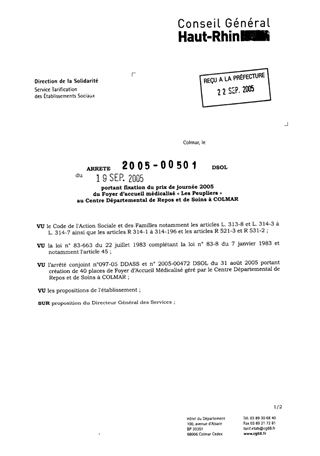 portant fixation du prix de journée 2005 du foyer d'accueil médicalisé "Les Peupliers" au centre départemental de repos et de soins à COLMAR. Resumé Pièces jointes ARRETE Assemblée : Non défini Date : 19/09/2005 Rapporteur : Non défini Collectivité : Conseil départemental du Haut-Rhin Direction : Non défini Service : Service de la Tarification des Etablissements Domaine : Prix de Journée Commission :