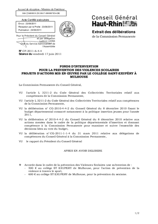 Le Fonds d'Intervention pour la prévention des Violences Scolaires est un dispositif doté de 30 000 € en 2011, destiné à encourager et à soutenir des projets d'actions mis en œuvre dans et aux abords des collèges afin de prévenir les violences scolaires et les incivilités. Dans ce cadre, le collège St Exupéry de Mulhouse présente deux projets pour un montant total de 1 100 €. Il est proposé d'autoriser, pour les actions présentées, le versement du financement correspondant au collège porteur du projet.