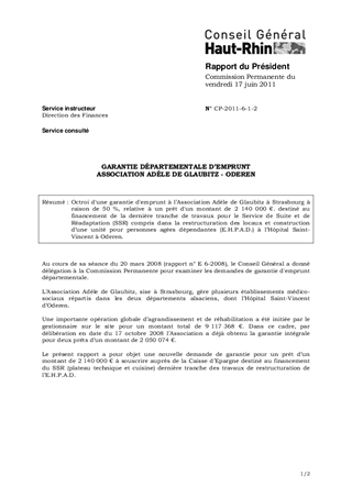 Octroi d'une garantie d'emprunt à l’Association Adèle de Glaubitz à Strasbourg à raison de 50 %, relative à un prêt d'un montant de 2 140 000 €. destiné au financement de la dernière tranche de travaux pour le Service de Suite et de Réadaptation (SSR) compris dans la restructuration des locaux et construction d’une unité pour personnes agées dépendantes (E.H.P.A.D.) à l’Hôpital Saint-Vincent à Oderen.