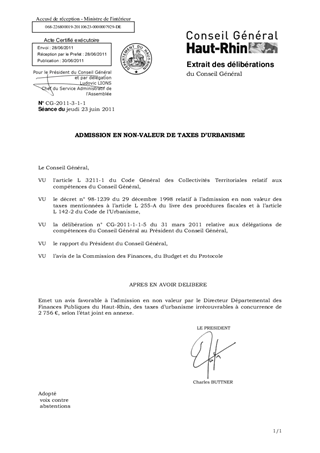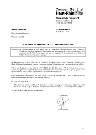 Le Département a été saisi par le Directeur Départemental des Finances Publiques du Haut-Rhin sur l’admission en non valeur de taxes d’urbanisme d’un montant de 2 756 € qui s’avèrent irrécouvrables. Cette admission ne fait pas l’objet d’une inscription au budget.
