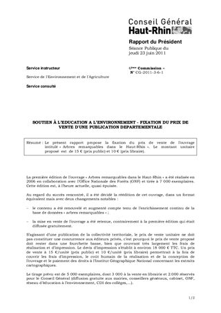 Le présent rapport propose la fixation du prix de vente de l’ouvrage intitulé « Arbres remarquables dans le Haut-Rhin ». Le montant unitaire proposé est de 15 € (prix public) et 10 € (prix libraire).