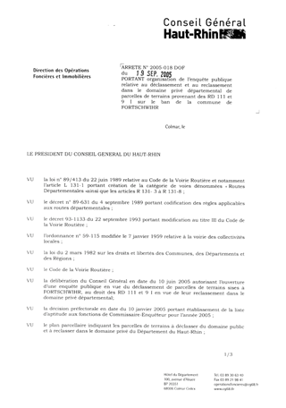 portant organisation de l'enquête publique relative au déclassement et au reclassement dans le domaine privé départemental de parcelles de terrains provenant des RD 111 et 9 I sur le ban de la commune de FORTSCHWIHR. Resumé Pièces jointes ARRETE Assemblée : Non défini Date : 19/09/2005 Rapporteur : Non défini Collectivité : Conseil départemental du Haut-Rhin Direction : Non défini Service : Service du Patrimoine et du droit des Sols Domaine : Déclassement de voirie Commission :