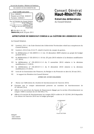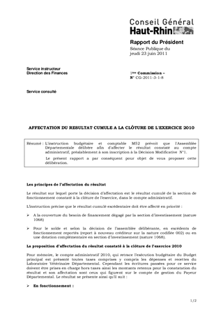 L'instruction budgétaire et comptable M52 prévoit que l'Assemblée Départementale délibère afin d'affecter le résultat constaté au compte administratif, préalablement à son inscription à la Décision Modificative N°1. Le présent rapport a par conséquent pour objet de vous proposer cette délibération.