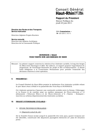 Le présent rapport concerne la création d'un itinéraire cyclable, le long des berges du Rhin entre Huningue et Bâle. Par ailleurs, ce rapport propose l'approbation du programme, de l'enveloppe financière du projet et des co-financements ; il donne enfin délégation à la Commission Permanente pour prendre l'ensemble des décisions relatives à cette opération.