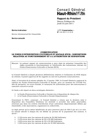 Le présent rapport de communication a pour objet de présenter l'ensemble des règles encadrant le fonctionnement et l'attribution des subventions relevant du Fonds d'Intervention Culturelle et Sociale (FICS)