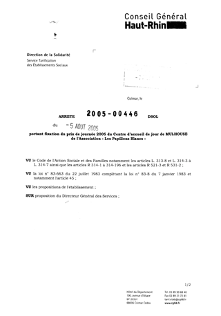 portant fixation du prix de journée 2005 du centre d'accueil de jour de MULHOUSE de l'Association "Les Papillons Blancs". Resumé Pièces jointes ARRETE Assemblée : Non défini Date : 20/09/2005 Rapporteur : Non défini Collectivité : Conseil départemental du Haut-Rhin Direction : Non défini Service : Service de la Tarification des Etablissements Domaine : Prix de Journée Commission :