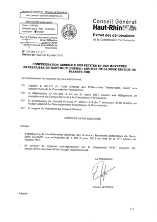 La Confédération Générale des Petites et des Moyennes Entreprises du Haut-Rhin (CGPME) sollicite le soutien financier du Département du Haut-Rhin pour sa participation à la 9 ème édition de Planète PME. Un crédit de 1 360 € pourrait être affecté à cette opération.