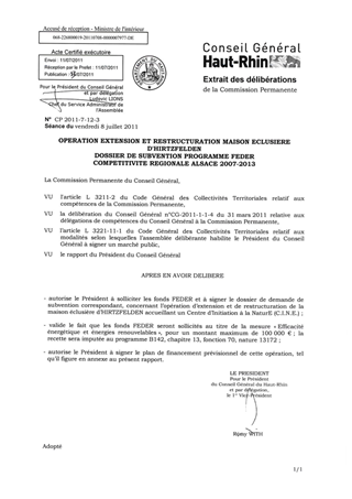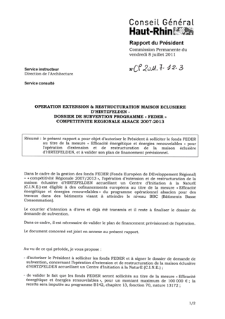 OPERATION EXTENSION ET RESTRUCTURATION MAISON ECLUSIERE D'HIRTZFELDEN DOSSIER DE SUBVENTION PROGRAMME FEDER COMPETITIVITE REGIONALE ALSACE 2007-2013 Resumé Pièces jointes DELIBERATION RAPPORT Assemblée : Commission Permanente Date : 08/07/2011 Rapporteur : Non défini Collectivité : Conseil départemental du Haut-Rhin Direction : Non défini Service : Direction de l'Architecture Domaine : Urbanisme Commission : Commission Permanente