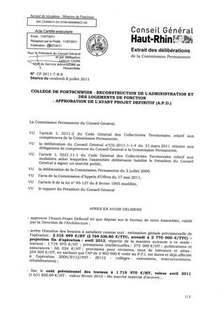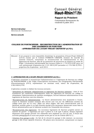 COLLEGE DE FORTSCHWIHR - RECONSTRUCTION DE L'ADMINISTRATION ET DES LOGEMENTS DE FONCTION - APPROBATION DE L'AVANT PROJET DEFINITIF (A.P.D.)