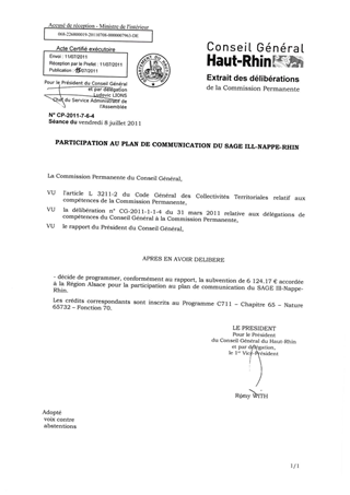 Lors de sa réunion du 23 juin 2011, le Conseil Général a voté les crédits nécessaires au paiement de la participation départementale au plan de communication mené par la Région Alsace concernant le SAGE Ill-Nappe-Rhin. Le rapport propose de programmer la subvention de 6124.17 € accordée à la Région pour cette opération. Les crédits correspondants sont inscrits au Programme C711 - Chapitre 65 - Nature 65732 - Fonction 70.