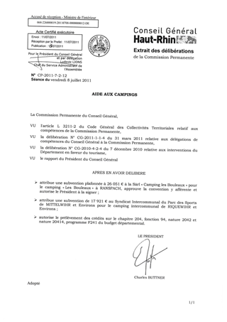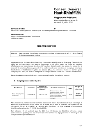 AIDE AUX CAMPINGS Resumé Il est proposé d'attribuer un montant total de subventions de 43 972 € en faveur de deux porteurs de projets. Pièces jointes DELIBERATION RAPPORT Assemblée : Commission Permanente Date : 08/07/2011 Rapporteur : Non défini Collectivité : Conseil départemental du Haut-Rhin Direction : Non défini Service : Service Développement Economique Domaine : Tourisme Commission : Commission Permanente