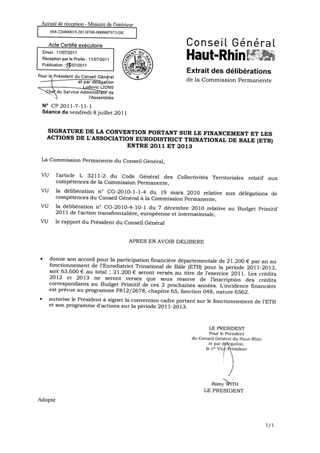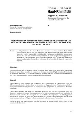 SIGNATURE DE LA CONVENTION PORTANT SUR LE FINANCEMENT ET LES ACTIONS DE L'ASSOCIATION EURODISTRICT TRINATIONAL DE BALE (ETB) ENTRE 2011 ET 2013