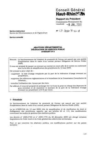 ABATTOIR DEPARTEMENTAL DELEGATION DE SERVICE PUBLIC AVENANT N° 3 Resumé Pièces jointes DELIBERATION RAPPORT Assemblée : Commission Permanente Date : 08/07/2011 Rapporteur : Non défini Collectivité : Conseil départemental du Haut-Rhin Direction : Non défini Service : Direction de l'Environnement et du Cadre de Vie Domaine : Agriculture Commission : Commission Permanente