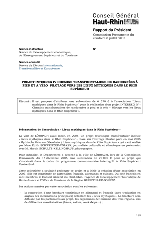 Il est proposé d'attribuer une subvention de 6 570 € à l'association "Lieux mythiques dans le Rhin Supérieur" pour la réalisation d'un projet INTERREG IV « Chemins transfrontaliers de randonnées à pied et à vélo – Pilotage vers les lieux mythiques dans le Rhin Supérieur ».