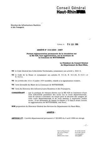 portant réglementation permanente de la circulation sur la RD 429, hors agglomération, sur le territoire de la commune de WITTENHEIM. Resumé Pièces jointes ARRETE Assemblée : Non défini Date : 26/09/2005 Rapporteur : Non défini Collectivité : Conseil départemental du Haut-Rhin Direction : Non défini Service : Direction des Routes Domaine : Circulation Commission :
