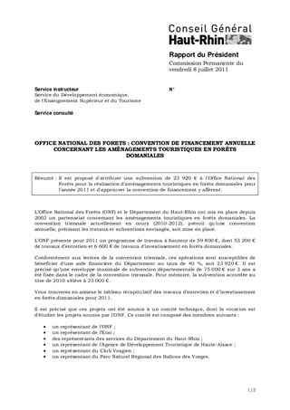 Il est proposé d'attribuer une subvention de 23 920 € à l'Office National des Forêts pour la réalisation d'aménagements touristiques en forêts domaniales pour l'année 2011 et d'approuver la convention de financement y afférent.