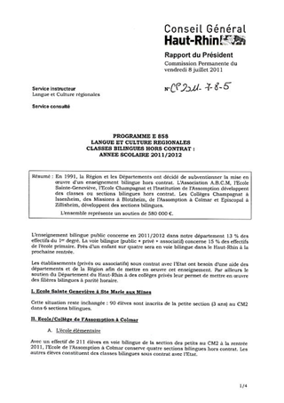 En 1991, la Région et les Départements ont décidé de subventionner la mise en œuvre d'un enseignement bilingue hors contrat. L’Association A.B.C.M, l’Ecole Sainte-Geneviève, l’Ecole Champagnat et l’Institution de l’Assomption développent des classes ou sections bilingues hors contrat. Les Collèges Champagnat à Issenheim, des Missions à Blotzheim, de l’Assomption à Colmar et Episcopal à Zillisheim, développent des sections bilingues. L’ensemble représente un soutien de 580 000 €.