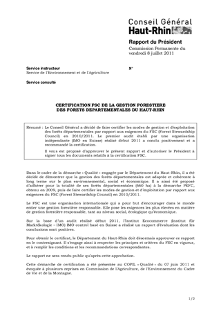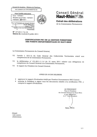 Le Conseil Général a décidé de faire certifier les modes de gestion et d’exploitation des forêts départementales par rapport aux exigences du FSC (Forest Stewardship Council) en 2010/2011. Le premier audit établi par une organisation indépendante (IMO en Suisse) réalisé début 2011 a conclu positivement et a recommandé la certification. Il vous est proposé d’approuver le présent rapport et d’autoriser le Président à signer tous les documents relatifs à la certification FSC.