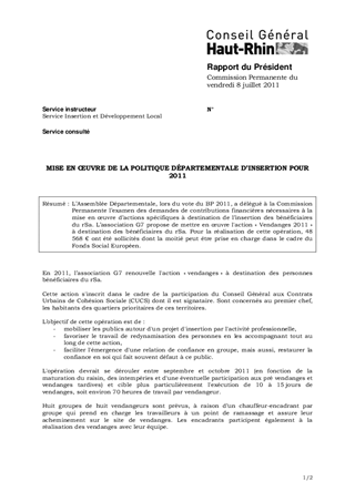 L’Assemblée Départementale, lors du vote du BP 2011, a délégué à la Commission Permanente l’examen des demandes de contributions financières nécessaires à la mise en œuvre d’actions spécifiques à destination de l’insertion des bénéficiaires du rSa. L’association G7 propose de mettre en œuvre l'action « Vendanges 2011 » à destination des bénéficiaires du rSa. Pour la réalisation de cette opération, 48 568 € ont été sollicités dont la moitié peut être prise en charge dans le cadre du Fonds Social Européen.