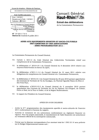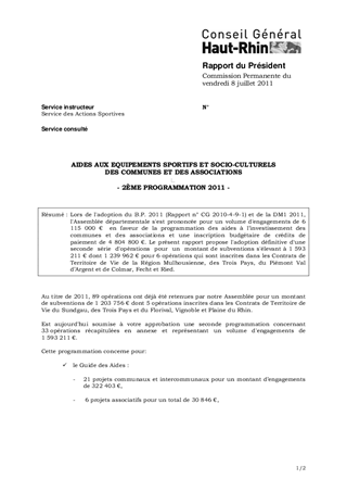 Lors de l'adoption du B.P. 2011 (Rapport n° CG 2010-4-9-1) et de la DM1 2011, l'Assemblée départementale s'est prononcée pour un volume d'engagements de 6 115 000 € en faveur de la programmation des aides à l’investissement des communes et des associations et une inscription budgétaire de crédits de paiement de 4 804 800 €. Le présent rapport propose l'adoption définitive d'une seconde série d'opérations pour un montant de subventions s'élevant à 1 593 211 € dont 1 239 962 € pour 6 opérations qui sont inscrites dans les Contrats de Territoire de Vie de la Région Mulhousienne, des Trois Pays, du Piémont Val d’Argent et de Colmar, Fecht et Ried.