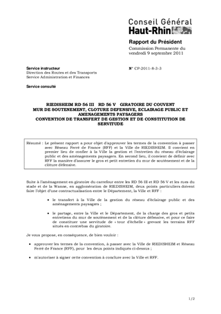 Le présent rapport a pour objet d'approuver les termes de la convention à passer avec Réseau Ferré de France (RFF) et la Ville de RIEDISHEIM. Il convient en premier lieu de confier à la Ville la gestion et l’entretien du réseau d’éclairage public et des aménagements paysagers. En second lieu, il convient de définir avec RFF la manière d’assurer le gros et petit entretien du mur de soutènement et de la clôture défensive.