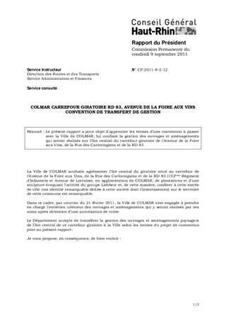 Le présent rapport a pour objet d'approuver les termes d’une convention à passer avec la Ville de COLMAR, lui confiant la gestion des ouvrages et aménagements qui seront réalisés sur l’îlot central du carrefour giratoire de l'Avenue de la Foire aux Vins, de la Rue des Carlovingiens et de la RD 83.