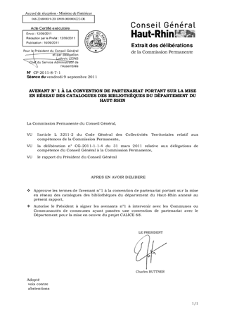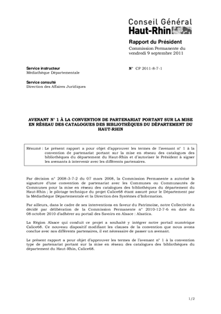 AVENANT N 1 À LA CONVENTION DE PARTENARIAT PORTANT SUR LA MISE EN RÉSEAU DES CATALOGUES DES BIBLIOTHEQUES DU DEPARTEMENT DU HAUT-RHIN
