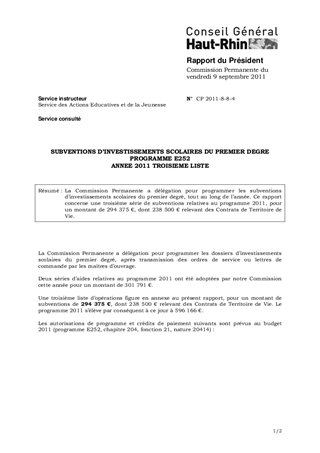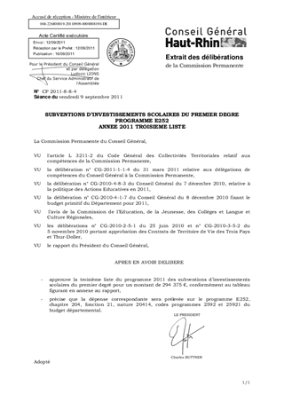SUBVENTIONS D’INVESTISSEMENTS SCOLAIRES DU PREMIER DEGRE PROGRAMME E252 ANNEE 2011 TROISIEME LISTE