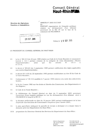 portant organisation de l'enquête publique relative au déclassement d'un délaissé provenant de la RD 44 sur le ban de la commune de FELDKIRCH. Resumé Pièces jointes ARRETE Assemblée : Non défini Date : 29/09/2005 Rapporteur : Non défini Collectivité : Conseil départemental du Haut-Rhin Direction : Non défini Service : Service du Patrimoine et du droit des Sols Domaine : Déclassement de voirie Commission :