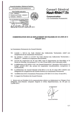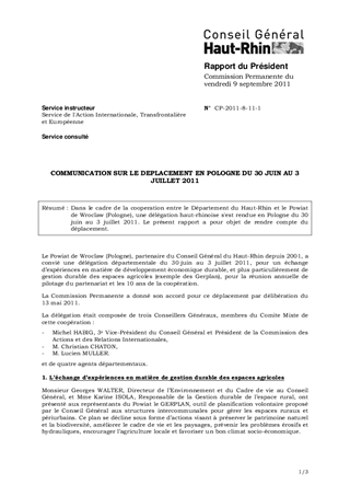 Dans le cadre de la cooperation entre le Département du Haut-Rhin et le Powiat de Wroclaw (Pologne), une délégation haut-rhinoise s'est rendue en Pologne du 30 juin au 3 juillet 2011. Le présent rapport a pour objet de rendre compte du déplacement.