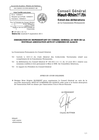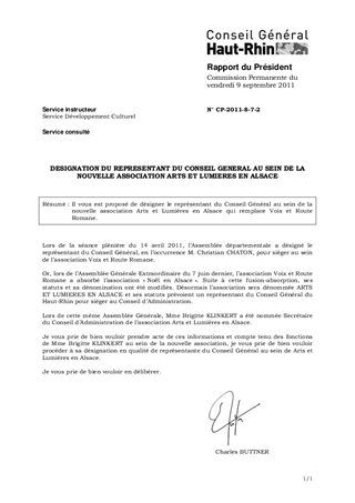 Il vous est proposé de désigner le représentant du Conseil Général au sein de la nouvelle association Arts et Lumières en Alsace qui remplace Voix et Route Romane.