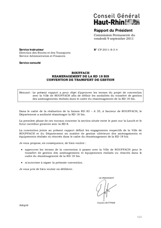 Le présent rapport a pour objet d'pprouver les termes du projet de convention avec la Ville de ROUFFACH afin de définir les modalités du transfert de gestion des aménagements réalisés dans le cadre du réaménagement de la RD 18 bis.