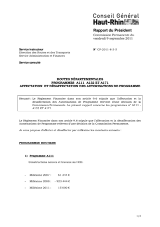 Le Règlement Financier dans son article 9.6 stipule que l’affectation et la désaffectation des Autorisations de Programme relèvent d’une décision de la Commission Permanente. Le présent rapport concerne les programmes n° A111 - A132 ET A171.