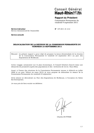 Le présent rapport a pour objet de proposer la tenue décentralisée de la réunion de la Commission Permanente le vendredi 23 septembre 2011 au parc des Expositions de Mulhouse.