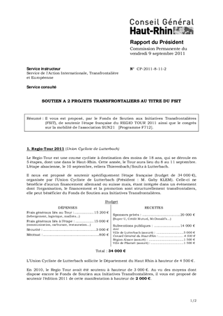 Il vous est proposé, par le Fonds de Soutien aux Initiatives Transfrontalières (FSIT), de soutenir l'étape française du REGIO TOUR 2011 ainsi que le congrès sur la mobilité de l'association SUN21 [Programme F712].