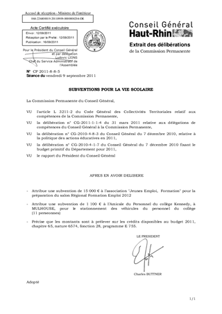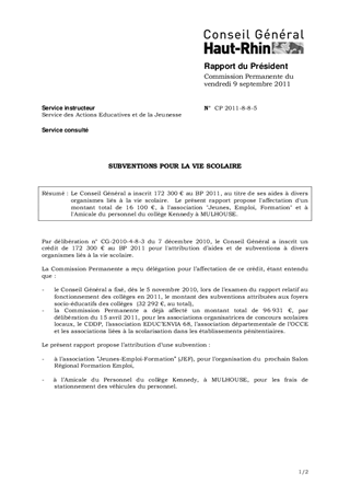 Le Conseil Général a inscrit 172 300 € au BP 2011, au titre de ses aides à divers organismes liés à la vie scolaire. Le présent rapport propose l'affectation d'un montant total de 16 100 €, à l'association "Jeunes, Emploi, Formation" et à l'Amicale du personnel du collège Kennedy à MULHOUSE.