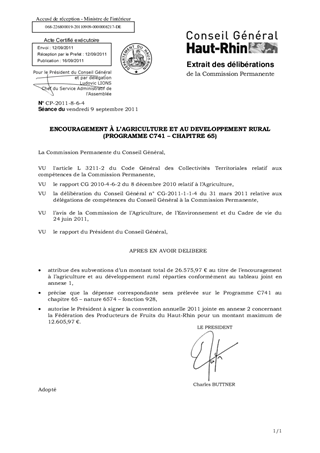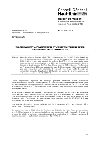 Dans le cadre du Budget Primitif 2011, un montant de 174.000 € a été inscrit au titre de l’encouragement à l’agriculture et au développement rural (rapport CG 2010-4-6-2). Il vous est proposé de prélever 26.575,97 € sur ces crédits pour soutenir les actions envisagées pour 2011 par les organismes récapitulés dans le tableau ci-joint (annexe 1). Pour l’un d’entre eux, la Fédération des Producteurs de Fruits du Haut-Rhin, un partenariat avec le Département a été contractualisé par une convention cadre triennale. Il vous est proposé de valider le projet de convention annuelle d’application 2011, joint en annexe 2, pour un montant de subvention maximum de 12.605,97 €.