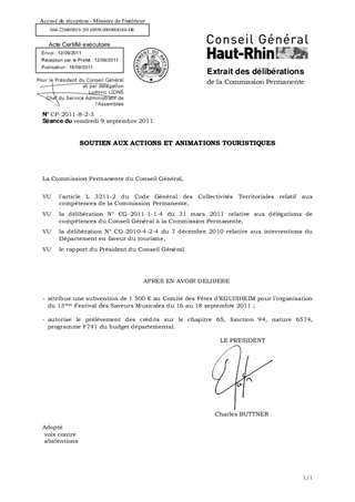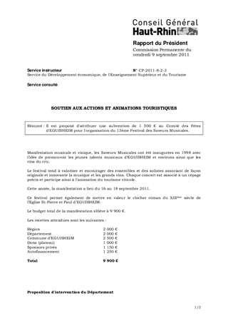 Il est proposé d'attribuer une subvention de 1 500 € au Comité des Fêtes d'EGUISHEIM pour l'organisation du 13ème Festival des Saveurs Musicales.